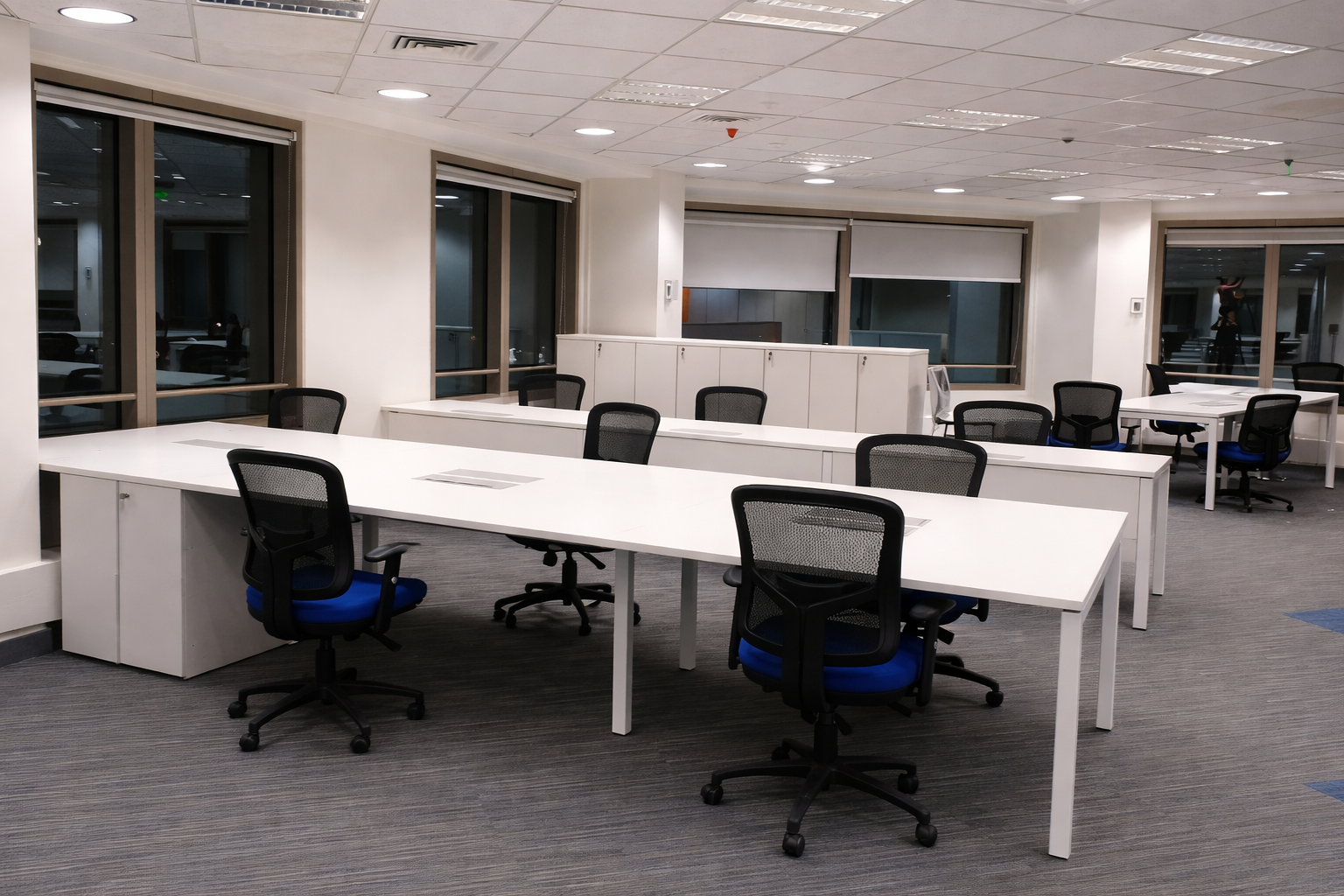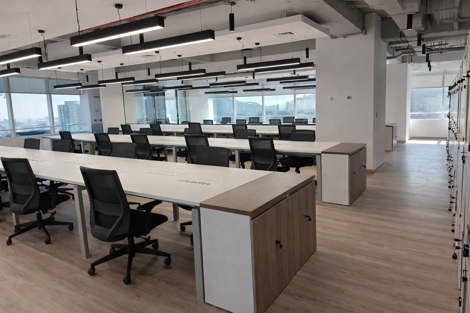 Proyecto corporativo en Santiago Centro, desarrollado con foco en rapidez y funcionalidad. Estaciones tipo bench, mobiliario de línea plana, lockers y mesones altos para un flujo de trabajo ágil y moderno.