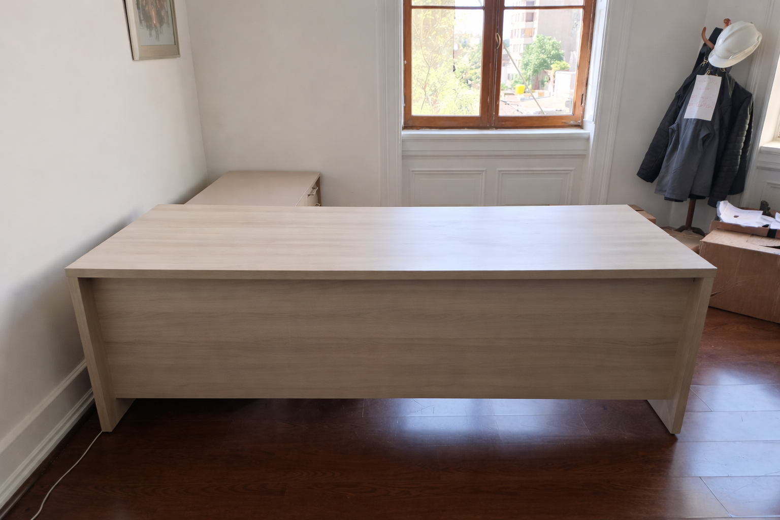 A partir de las necesidades del equipo, implementamos una propuesta de mobiliario sobria y luminosa, con terminaciones en tonos madera clara para aportar calidez sin perder el carácter profesional del espacio. El proyecto incluye escritorios amplios, una zona de reunión con mesa circular para encuentros ágiles, y una biblioteca/módulos de guardado que ordenan documentación y material de uso frecuente, manteniendo el ambiente despejado.