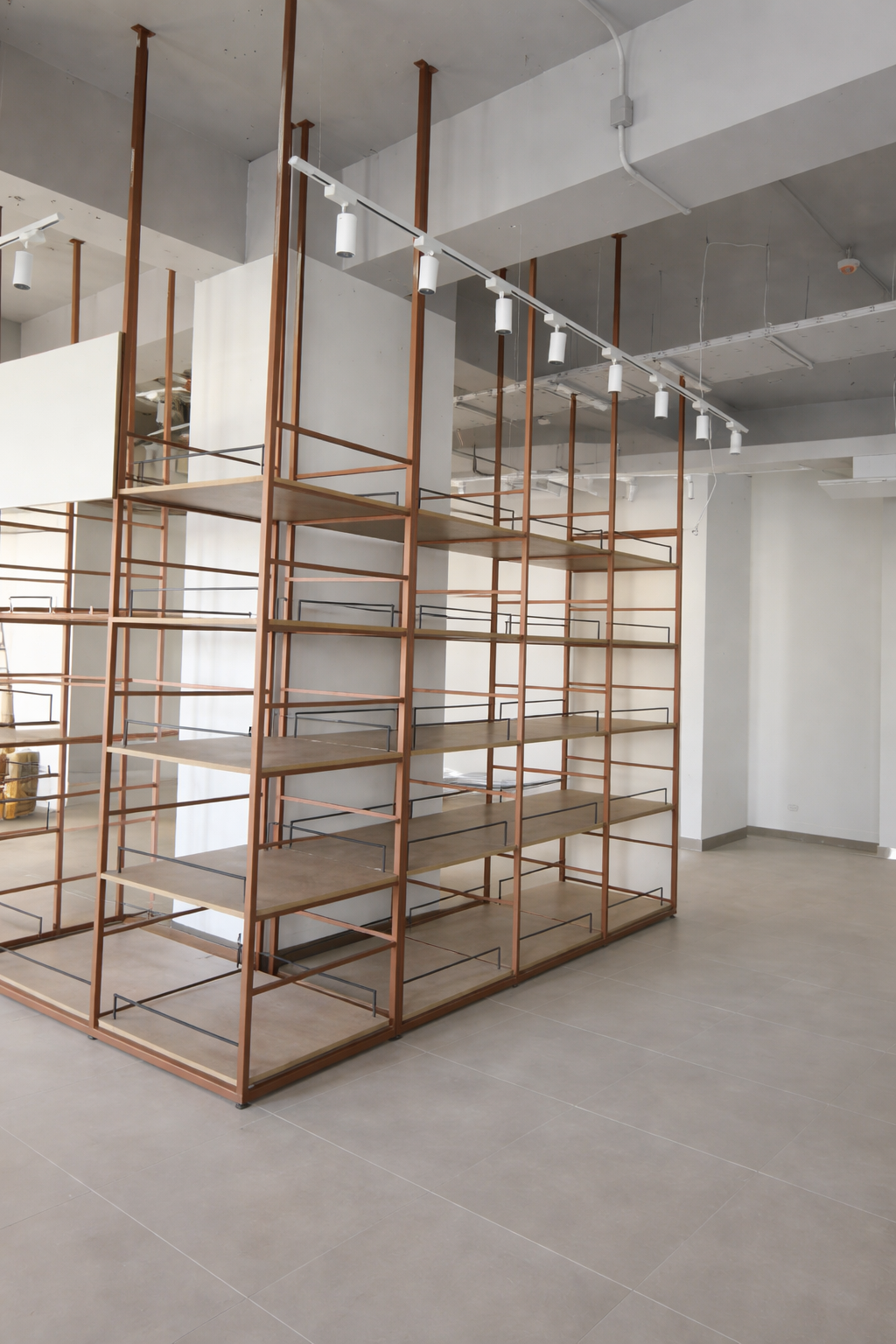 Desarrollamos y fabricamos estanterías modulares combinando estructura metálica en tono cobrizo con repisas de madera, incorporando barandas y detalles que mejoran la exhibición. Sumamos mesones de apoyo, carros y elementos complementarios pensados para la circulación y la experiencia de compra. El resultado: un espacio versátil, ordenado y con identidad propia, listo para adaptarse a cambios de producto y temporadas sin perder coherencia.